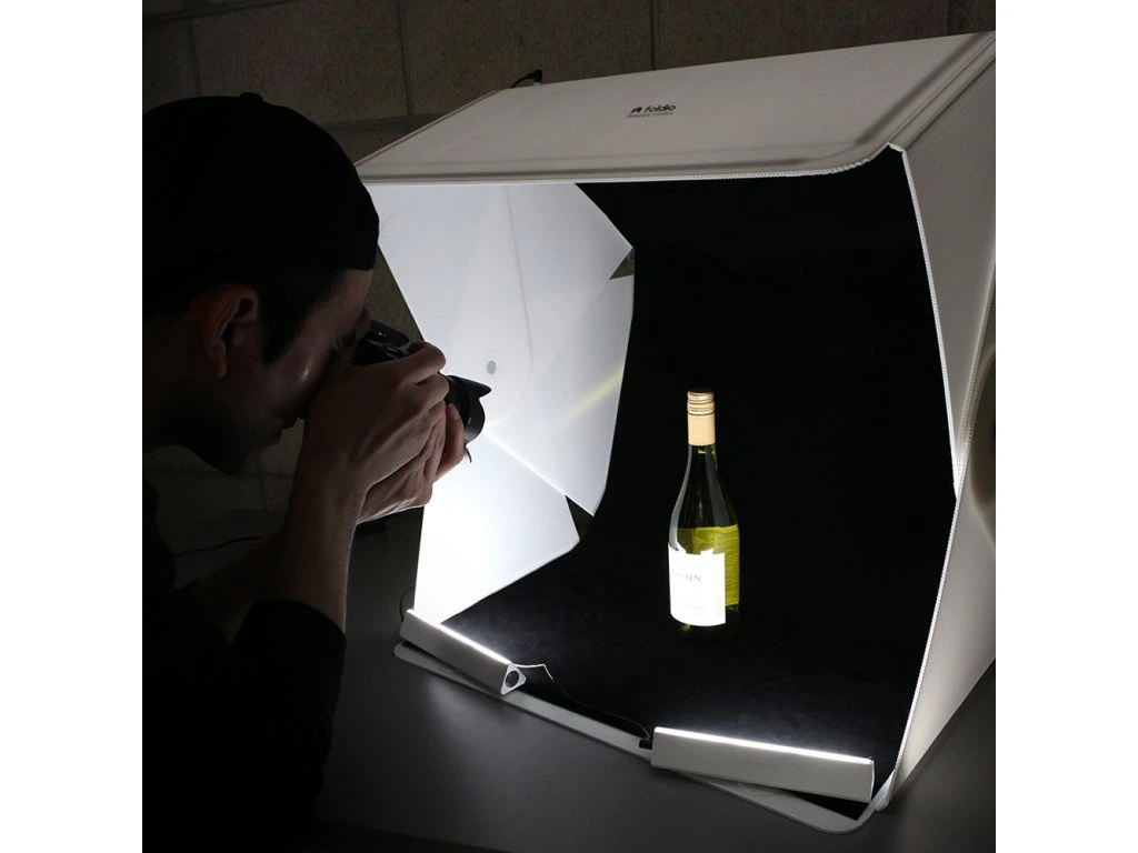 A világítóberendezés három LED-sávból áll, amelyek csökkentik a hordozható fotóstúdió belsejében lévő tárgy árnyékát.